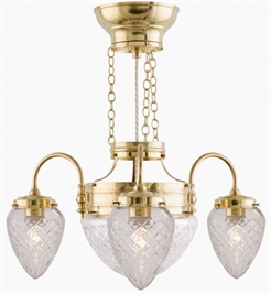 Oppheng er laget i polert, ulakkert messing, kupler i skjærslipt, klart blyglass.