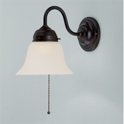 Lampett med klokkeskjerm. Armatur i mørk brun, patinert messing. Klokkeskjerm i 3-lags opalglass.