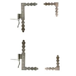 Stabel, stabelhengsel og hjørnejern i Ludvig 16 stil, galvanisert. Beslagene har preget mønster på fremsiden slik tradisjonen tilsier. Tidsperiode : 1780-1820 i Norge.